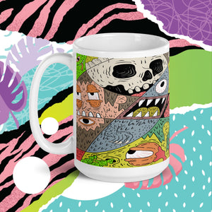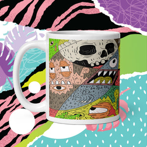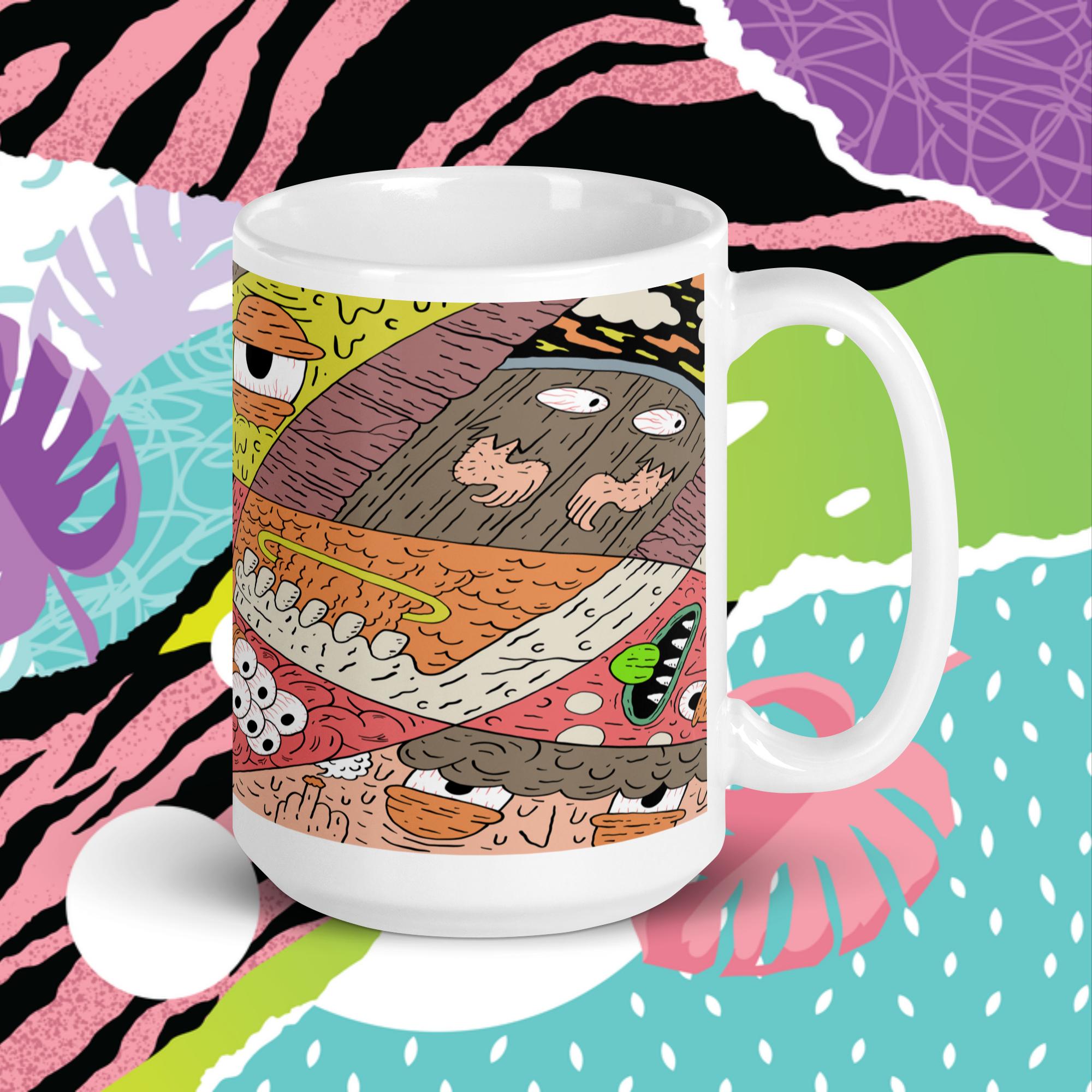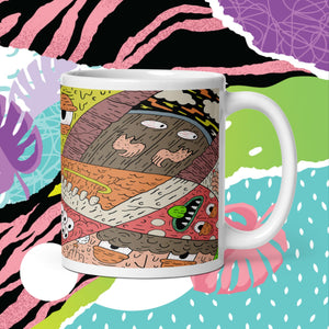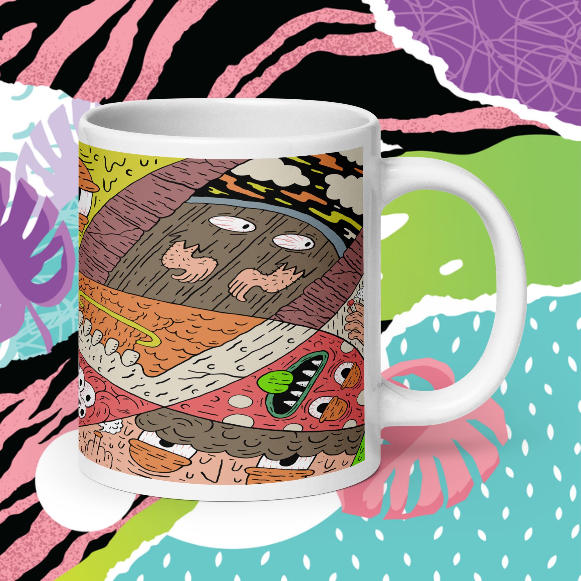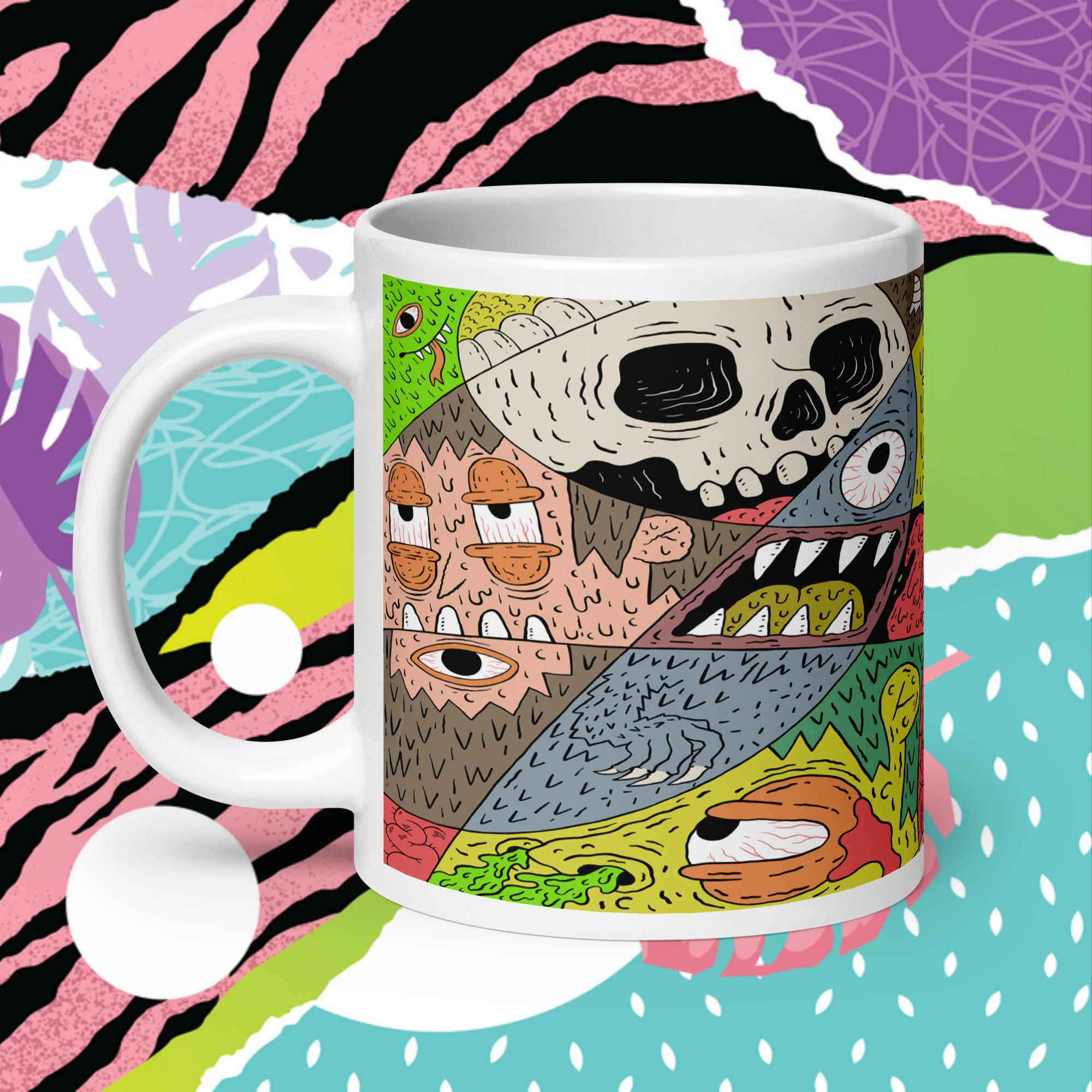 A swirling mess of teeth, sweat, eyeballs, and pizza flesh—Cosmic Cruddle is a visual brain dump pulled straight from the subconscious. Each panel of this mug’s wraparound design delivers a different kind of chaos: anxious stares, snarling grins, cartoon nightmares, and the occasional metaphysical shrug. It’s like sipping coffee out of a haunted sketchbook.