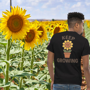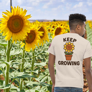 A reminder stitched in petals and roots. Keep Growing pairs a smiling sunflower with calm resilience. This design balances playful charm with a message of persistence, offering a wearable mantra for steady progress no matter the soil.