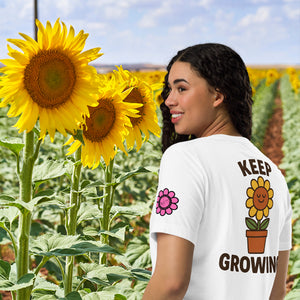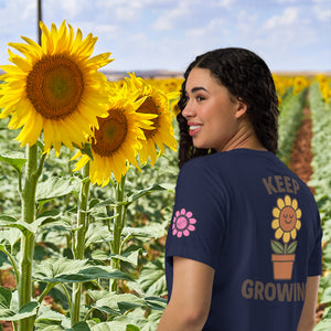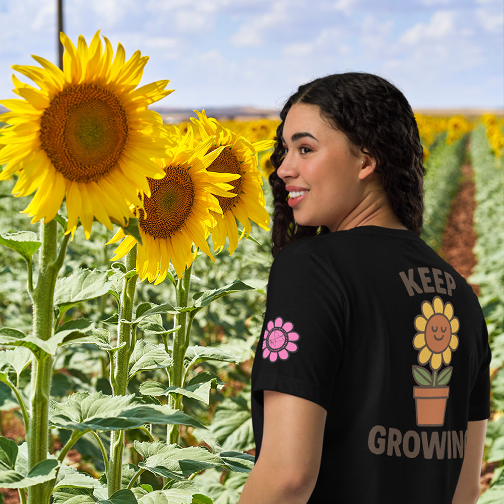 A reminder stitched in petals and roots—Keep Growing pairs a smiling sunflower with calm resilience. This design balances playful charm with a message of persistence, offering a wearable mantra for steady progress no matter the soil.